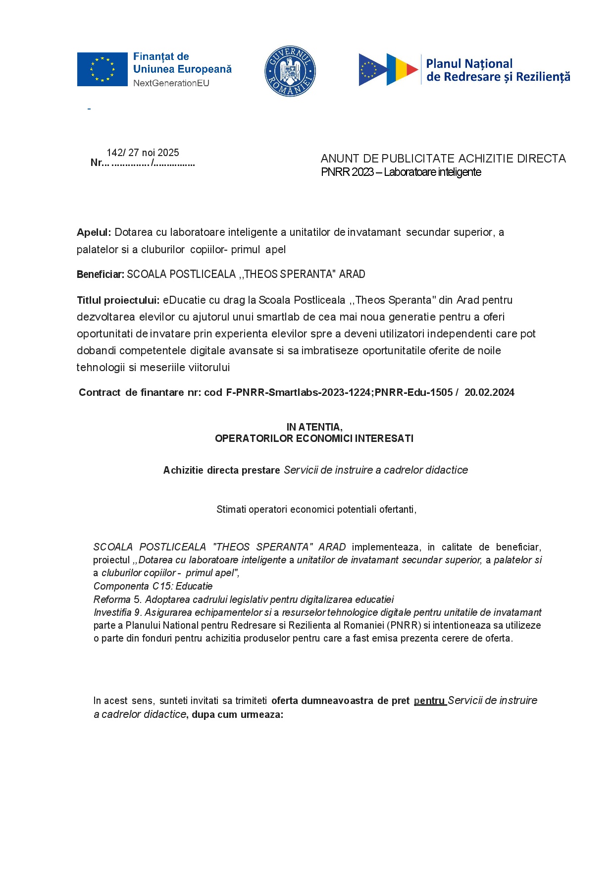 Contract de finantare nr: cod F-PNRR-Smartlabs-2023-1224;PNRR-Edu-1505 / 20.02.2024